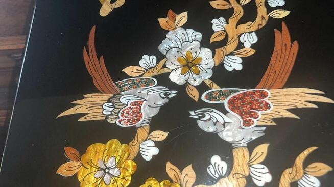 Obraz z laki. Made in Iran. Naklejka z tyłu obrazu- Syg. NAKHAEE- 2 ptaszki na gałęzi. Dekor inkrustowany macicą ...